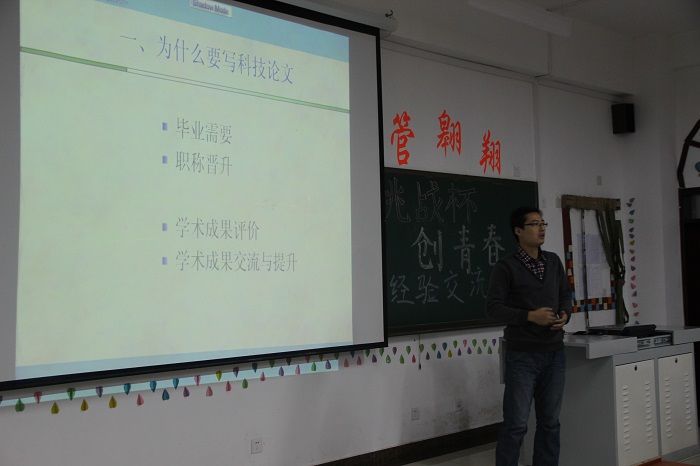李老师说:“中国当前的论文数量虽然在世界上仅次于美国,但其质量与很多发达国家差距明显,这就要求我们加强科技创新能力。”老师还以他的几篇论文为例,向同学们教授了如何进行科研论文写作,并对学生们在论文写作中可能出现的问题进行了分析。