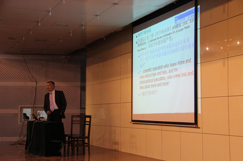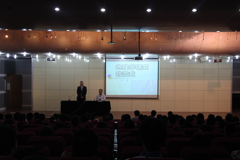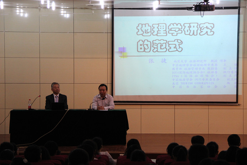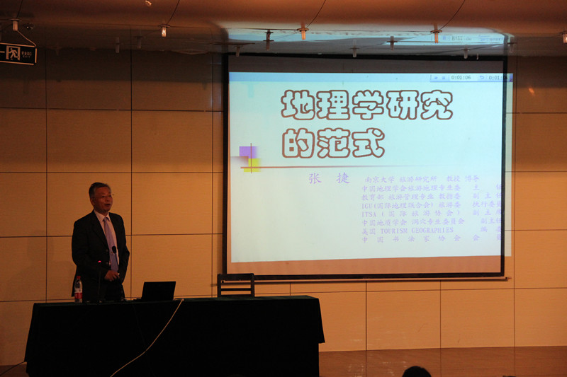 部分老师参加了报告会。 张捷教授是教育部旅游管理专业教学指导委员会副主任、中国地理学会旅游地理专业委员会主任、国际旅游研究会(ITSA)副主席、国际地理联合会(IGU)旅游休闲与全球变化专业委员会执行委员,博导。张教授报告的题目是地理学研究的范式。张教授首先以几个思维的例子开始,向大家介绍了几个著名的科学家做研究的过程。让大家了解了地理学的整体性。给大家分析说明自然地理学有淹没在环境科学和地理系统分析之中的倾向。张教授论述了思维问题对地理学的启发,介绍了地理学的若干定义。近三个小时的报告,张教授幽默风趣的语言让大家在快乐中开阔视野,学到了知识。