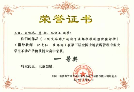我校参赛获奖作品“日照火车站地下商场征收评估报告”根据估价目的,遵循估价的程序,运用收益法、成本法和基准地价修正法,在充分的实地查勘、广泛收集有关市场信息和全面分析估价对象价格的影响因素的基础上,对估价对象市场价值进行了评估和测算,为地下商场评估提供了新的思路和实际操作参考,也为日照市地下商场的运营与流动提供了理论依据。作品顺利进入决赛,并经过展示、质询等环节,获得一等奖第一名,充分展现了我校土地资源管理专业建设水平。