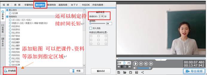 在模拟实习的备课过程中,我尝试加入了一些数字化软件的使用。没有电子白板展示课件,我便尝试通过软件进行合成,让课件尽可能自然地展示出来。现在许多视频剪辑软件功能非常强大,可以对录好的视频进行编辑、剪辑、配音解说、添加字幕、增加开头结尾等,这样可以使教学视频更清楚也更美观,我认为能提高教学效率。我采用了爱剪辑软件,在片头增加了本节课的题目,方便学生快速抓住本节课的内容;通过剪贴画功能,将课件一张一张贴在黑板旁边的墙上;我还用剪切功能,剪去一些冗余片段,使视频更加精炼。