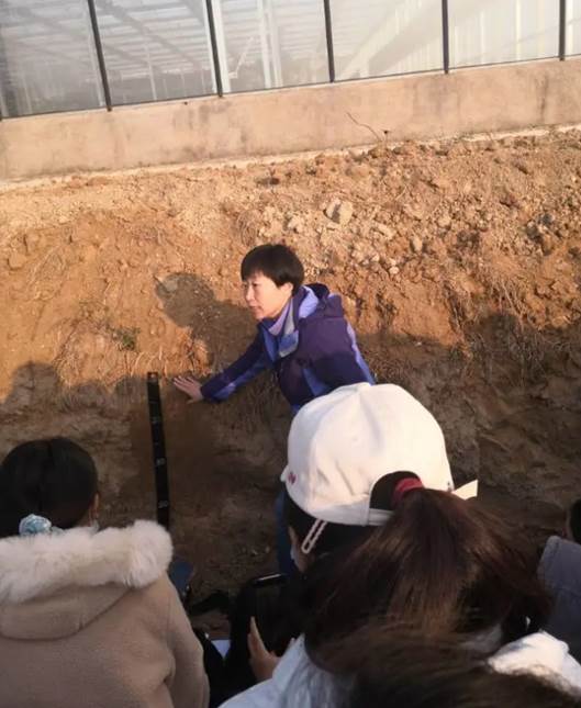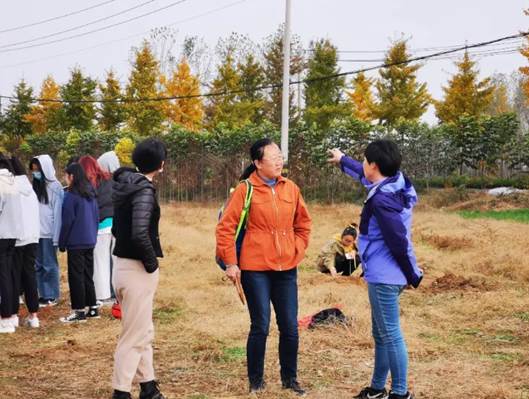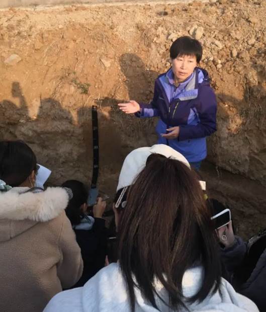 在自然气息浓厚的两城街道,潘继花、王振海为同学们详细介绍棕壤和潮土的地理分布、形成条件、形成特点与基本性状。同时生动地讲解土壤剖面样品采集与理化性质测试方法。之后,在老师的带领下,同学们用洛阳铲挖掘地面,并仔细观察剖面特征,进行发生层划分,认真记录各发生层形态特征。在完成采样点与剖面观测记录后将剖面复原。