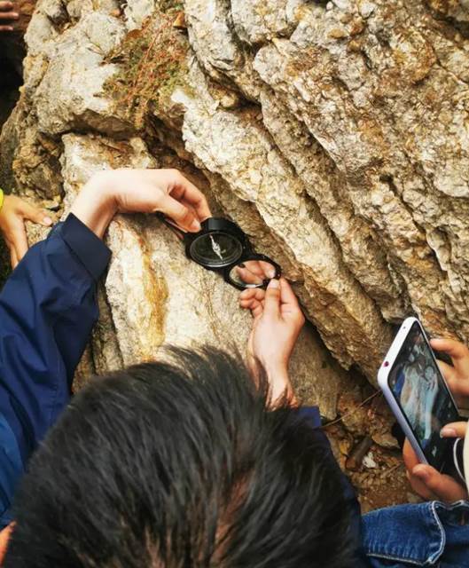 在浮来山地质公园,指导老师带领同学们学习岩石构造。刘飞在山脚下为区分豹皮灰岩和普通石灰岩的不同物质组成,向同学们展示了二者遇稀盐酸的不同反应现象。之后,同学们到达山顶,福寿碑的古老令同学们仿佛身处历史的轨迹中。同时,刘飞向同学们介绍浮来山的形成、出露地层岩性、地质构造以及地质历史,同时讲解罗盘的使用方法。同学们利用罗盘,分组进行岩石走向、倾向和倾角的测量,收获颇丰。
