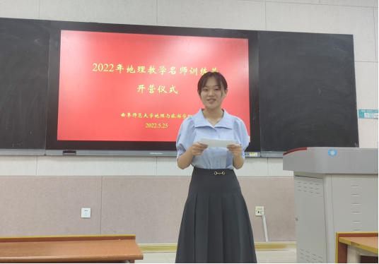 营员代表赵晓佳同学进行表态在发言中表示,全体营员一定会全身心投入训练、虚心接受指导老师们的批评,戒骄戒躁、精益求精,争取尽快提高从业技能,为将来成为一名地理教学名师奠定基础。