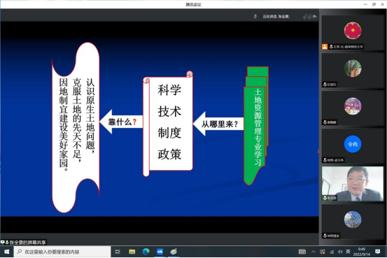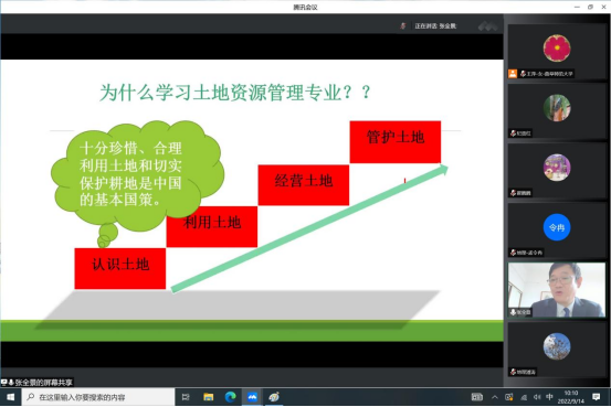 为加强2022级土地资源管理专业同学的专业认知,提高专业学习效率,明确未来发展方向,同时响应国家与学校的疫情防控要求,9月14日,麻豆视频 在线召开土地资源管理专业教育会。院长张全景教授担任主讲人,土地资源管理系(教学)系主任王萍主持,土地管理系全体教师和2022级土地资源管理专业全体同学参加。