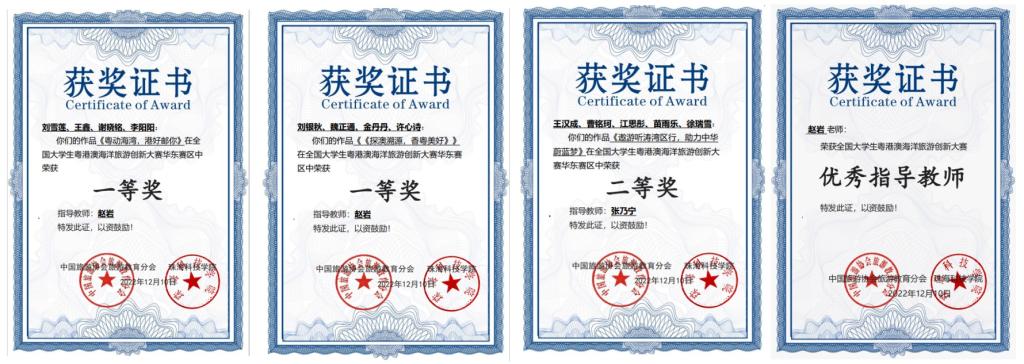 研究生刘雪莲、王鑫、谢晓铭和李阳阳等的参赛作品《粤动海湾 港好有你》,研究生刘银秋、魏正通、金丹丹和许心诗等的参赛作品《探奥溯源,香粤美好》在赵岩老师指导下荣获一等奖;本科生王汉成、曹铭珂、江思彤、苗雨乐、徐瑞雪等的参赛作品《遨游听涛湾区行,助力中华蔚蓝梦》在张乃宁老师指导下荣获二等奖。