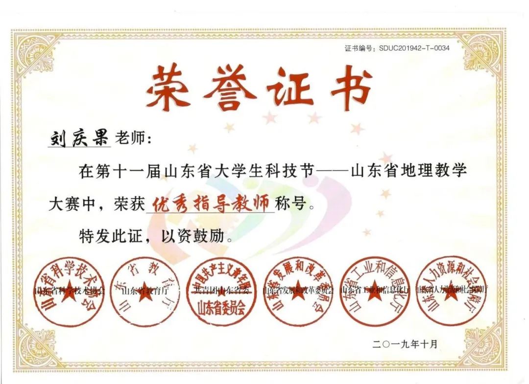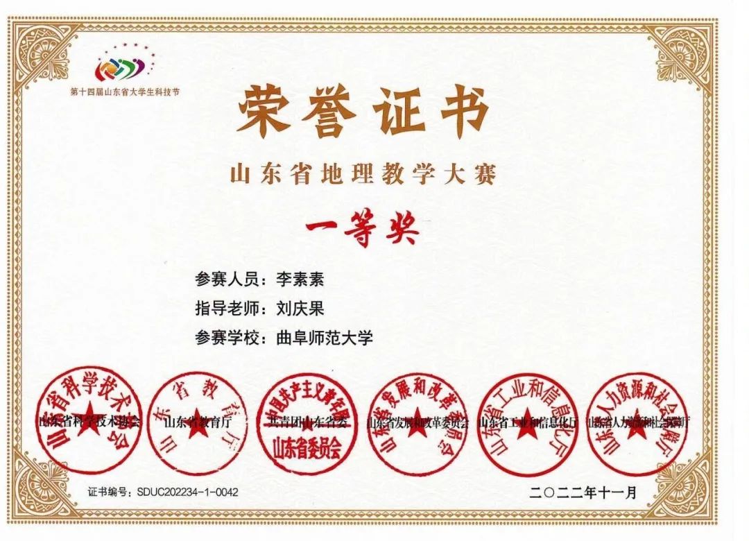 自2019年以来,连续4年指导山东省师范类高校学生从业技能大赛、山东省大学生科技节——山东地理教学技能大赛等赛事。三次(第八届、第九届、第十一届)获得山东省师范类高校学生从业技能大赛优秀辅导教师,指导学生获得山东省师范类高校学生从业技能大赛一等奖3次,其中2021年指导的程蓉同学获第九届山东省师范类高校学生从业技能大赛高中地理推荐组一等奖第一名;连续四次(第十一届、第十二届、第十三届、第十四届)获得山东省大学生科技节-山东地理教学技能大赛优秀指导教师;参与指导学生获得“田家炳杯”全日制教育硕士专业学位研究生学科教学(地理)教学技能大赛二等奖1次、三等奖1次。