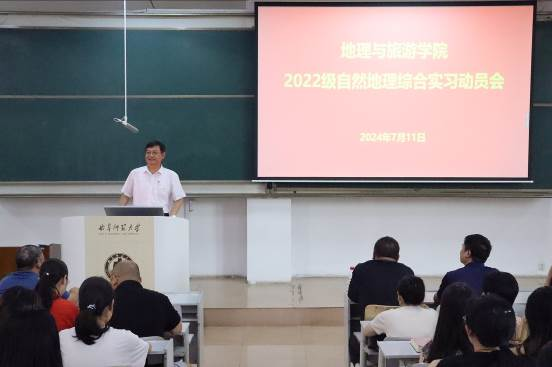 7月11日,学院领导、指导教师及2022级地理科学专业全体学生在A206教室召开实习动员会。会上,院长张全景强调暑期实习的重要性和意义,鼓励学生积极参与实习。将理论知识与实践相结合,提高自身综合素质,并着重强调实习期间的安全问题,确保学生自身的人身安全和财产安全。赵爽主任详细介绍实习的具体内容以及考核依据,鼓励学生积极与指导老师、同学交流,主动发现问题、解决问题,提高实习效果。刘飞老师对实习的日程安排和地点选择进行阐述,确保学生明确实习的具体要求和流程。最后,他强调野外实习中团队协作的重要性,通过实习锻炼学生的团队合作能力和交流沟通能力,为未来的学习和职业生涯奠定坚实基础。