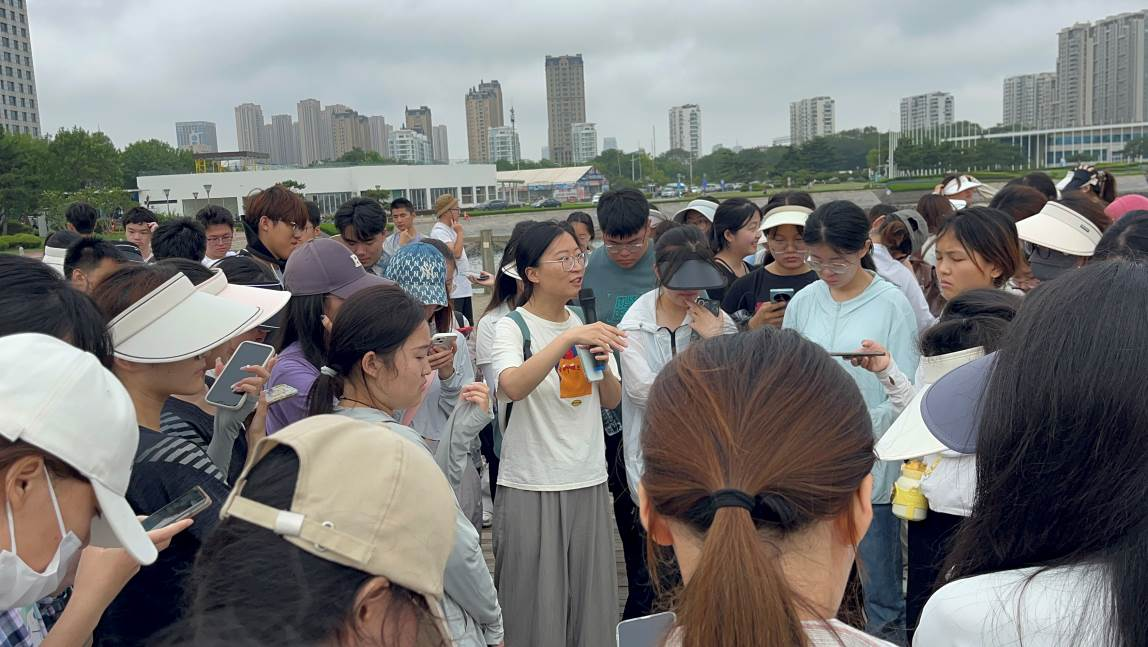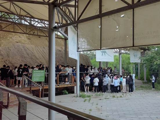 7月14日上午,师生集体来到刘家道口水闸,刘飞介绍了刘家道口的地理位置,以及水闸具体情况,李瑞平向大家介绍当地的河流水情要素,如水位、流量、流速等,及其意义和重要性,随后,她与同学们一起探讨弯曲系数对于航运的重要性,指导学生对河流、水库的水情进行考察和思考。接着,同学们来到岌山地质公园,在于深洋和刘飞的指导下,结合课堂学习的理论知识,观察恐龙足迹、褶皱构造、中生代砂岩、波痕、雨痕等地质现象。