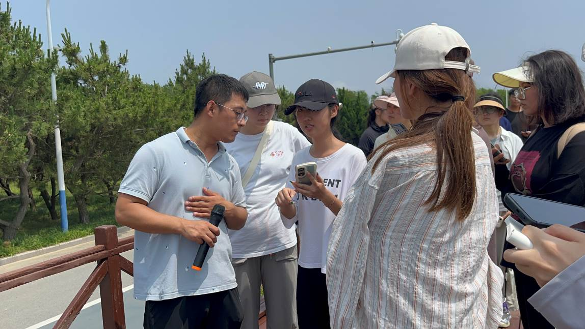 7月13日上午,同学们前往日照世帆赛基地周边海域,进行地貌学和气象学实习。赵爽首先对所到的潟湖从成因进行讲解,将潟湖与海洋的盐度、生物等进行对比,讲解波浪与海相沉积的相关知识。随后,同学们在孙博雯的指导下分小组开始进行空气湿度和风速的测量。同学们独立操作仪器,细心采集数据,严谨判断和记录,在测量过程中,指导老师给予耐心细致的指导。