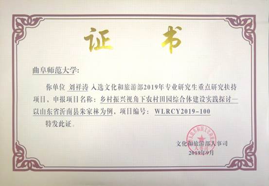 2018级旅游管理专业(MTA)研究生刘祥涛同学申报的《乡村振兴视角下农村田园综合体建设实践探讨-以山东省沂南县朱家林为例》项目成功入选,指导教师为石峰副教授。
