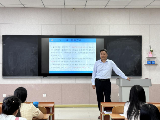 会上,吕宜平老师首先介绍了学院及学科教学(地理)专业的师资力量与办学状况,随后向同学们详细地介绍了人才培养方案的内容,对本专业的培养人才要求、学制及学习年限、培养方式及过程、专业课程设置、专业实践活动、毕业标准及学位要求等方面展开细致解读。