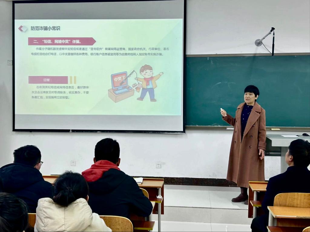 随后,辅导员赵岩就防范诈骗、消防安全、宿舍安全三个方面向同学们讲解了安全的重要性,她特别强调了防范诈骗的重要性,提醒大家提高警惕,远离网络和电信诈骗。此外,她就消防安全问题进行详细说明,呼吁培养宿舍和实验室的防火意识,倡导“四有四会”原则。最后,她特别强调了宿舍安全的重要性,希望同学们共同努力,营造一个安全、温馨的学习环境。