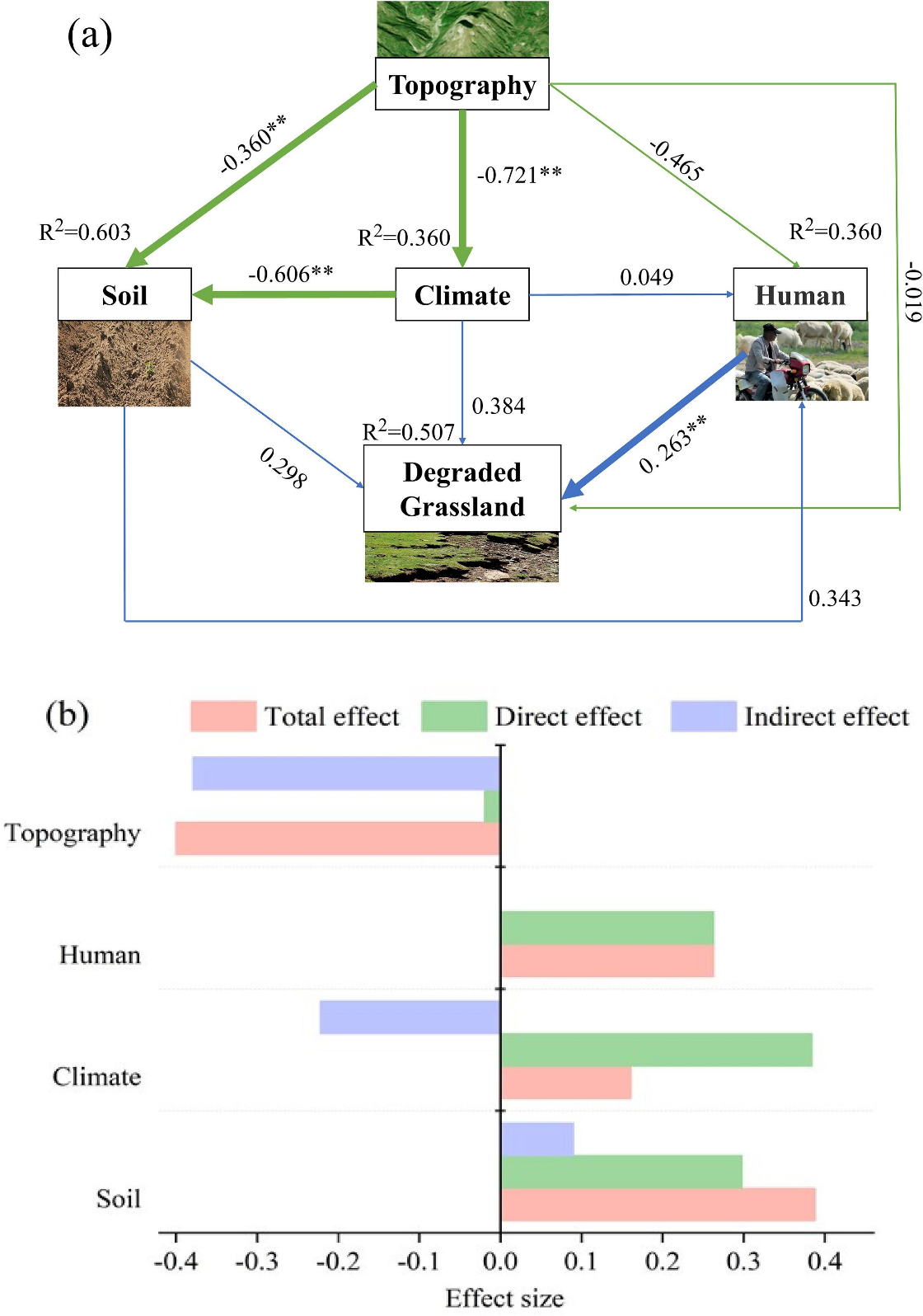 地形、人为、气候和土壤对草地退化影响的结构方程模型(a);地形、人类、气候和土壤对草地退化的直接、间接和总影响(b)。箭头的宽度与其相应路径系数的强度成正比。R2表示解释的方差比例。蓝色和绿色箭头分别表示正关系和负关系。**,P < 0.05