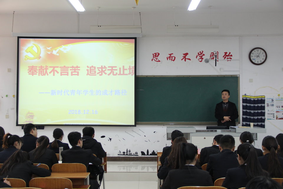“时代的责任赋予青年,时代的光荣属于青年”,刘书记对当代青年学生思想上的“四个不协调”和思想状况的“四个更加”现象加以分析,并从个人修养、职业能力、集体利益与人生价值四个方面阐明了大学生成才路径应具备的品格和精神。最后,他系统地向同学们讲述了新的历史时代赋予当代大学生的历史使命,他希望同学们把握好时代机遇,做时代的弄潮儿,努力把自己造就成新时代的栋梁之才。