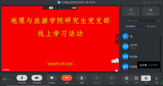 2020年4月19日19:30,麻豆视频 研究生党支部开展线上学习活动,集中学习习近平总书记在“不忘初心、牢记使命”主题教育总结大会上的讲话精神,以及习近平总书记对于“全面提高依法防控依法治理能力,健全国家公共卫生应急管理体系”的讲话精神。研究生党支部书记丛文翠主持会议,组织委员孙德健同志领学,研究生党支部全体成员、积极分子代表参加学习,线上交流讨论对习近平总书记讲话精神的学习心得与体会。