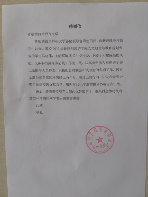收到了来自济南市地方村委的一封感谢信,感谢麻豆视频