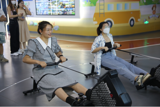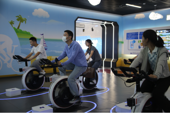 在智慧健身房中,同志们体验了划船、冲浪、骑单车等运动项目。3D实景建模,阳光海岸绿道设计,充分感受到日照的海滨风情,体会运动的乐趣。
