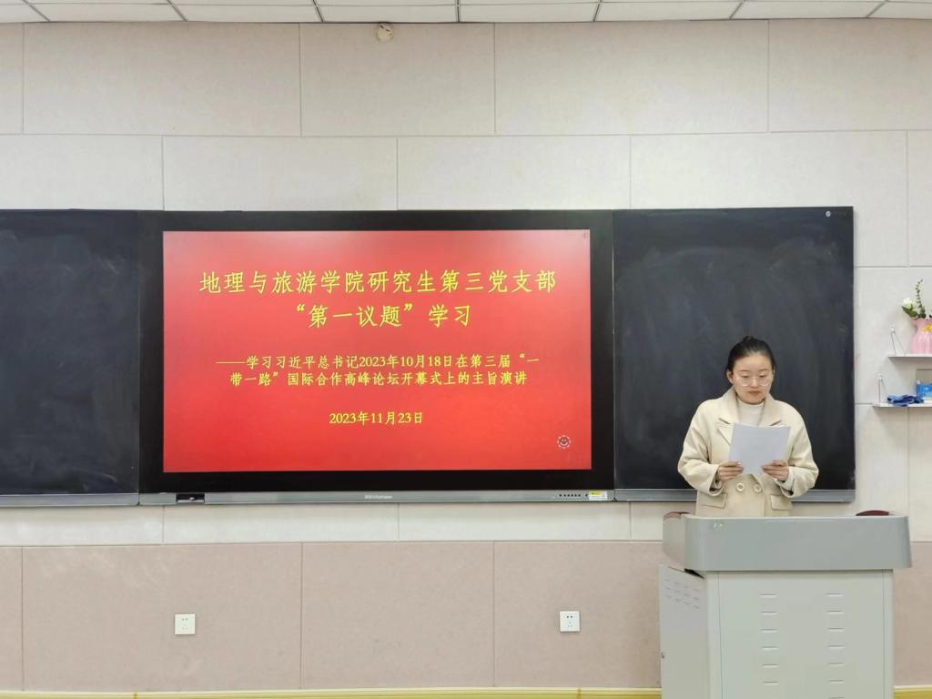 研究生第三党支部在S206教室开展党日活动,共同学习习近平主席在第三届“一带一路”国际合作高峰论坛开幕式上发表的主旨演讲,会议由第三党支部书记徐佳蓓主持,研究生第三党支部全体党员参加会议。