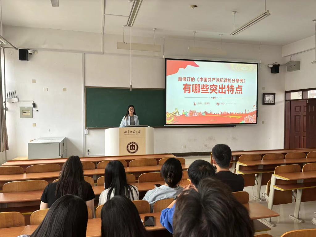 研究生第一党支部在S413教室召开党纪学习教育专题党课活动,本次党课由支部书记吕潇雨同志主讲,支部全体党员参加。
