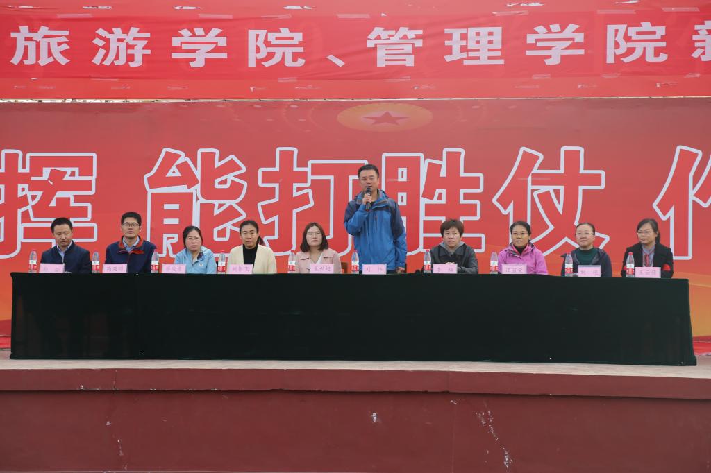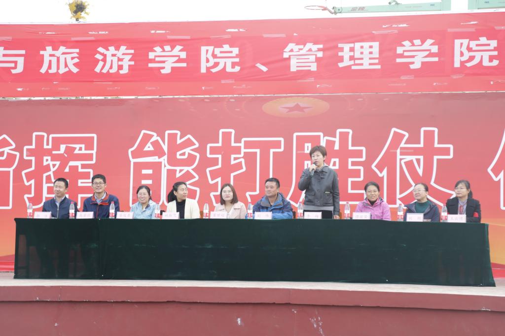 为响应国家体育强国号召,提高学生身心素质,丰富学生课余生活。10月26日,地理与旅学院与管理学院于学校西田径场举办联谊运动会。本次运动会由两院团委学生会联合主办,体育部承办,有幸邀请到地理与旅学院党委副书记刘伟、2019级辅导员李梅,管理学院2019级辅导员董世超及地理旅游学院2019级班主任谭丽荣、刘艳、王云倩、郭浩,管理学院2019级班主任姚振飞、蔡俊青、高英朋出席开幕式,两院2019级全体学生参加。