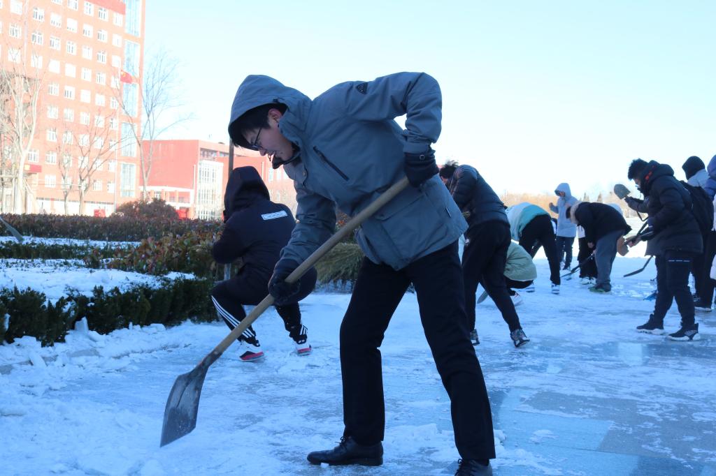 党委副书记刘伟带领辅导员宁晓文、李梅、董青、田青、张乃宁、陈鑫、学生党员、团委学生会干部、入党积极分子于S楼北门前开展清雪除冰行动。