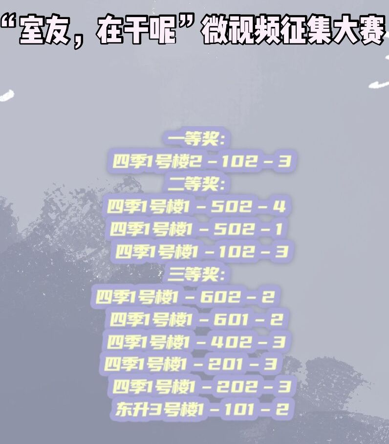 举办“室友,在干嘛呢”微视频征集比赛,通过征集与舍友间生活的点点滴滴来反映宿舍里的温馨氛围。下面是本次活动的获奖名单: