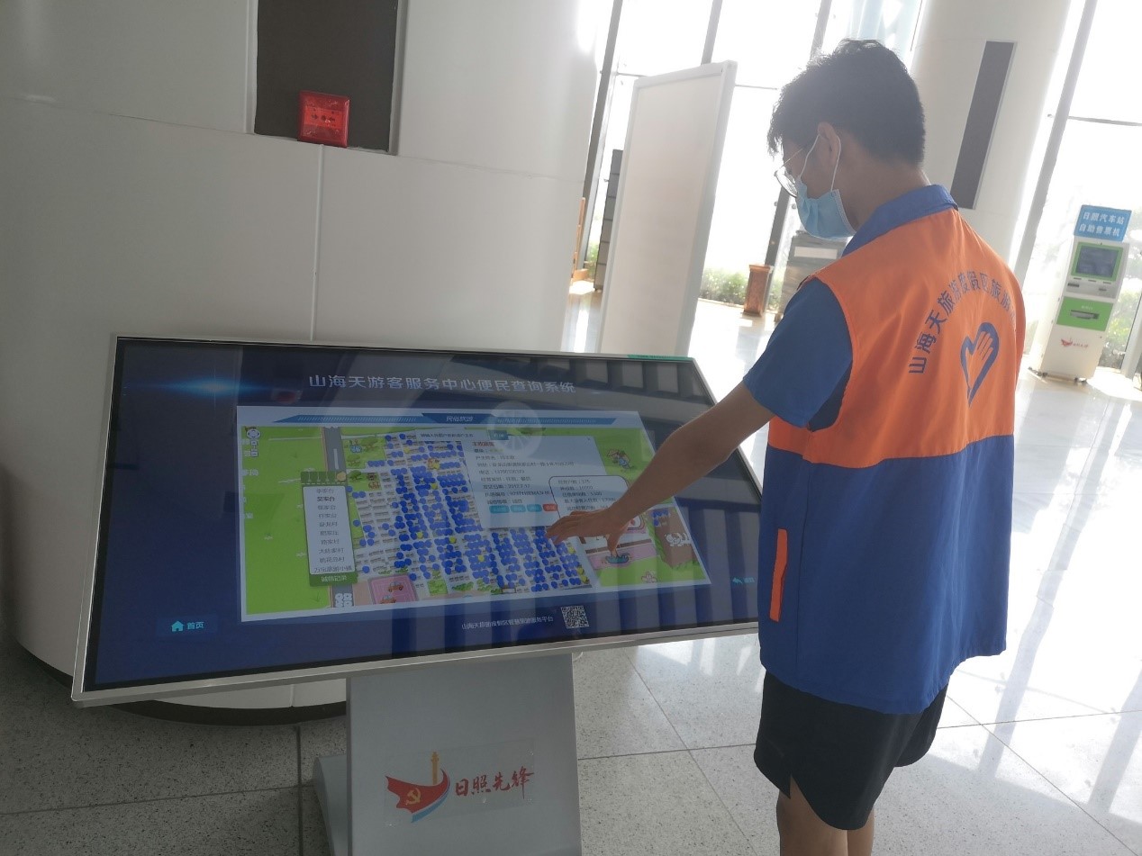 “数字驱动发展,科技引领未来”,互联网+旅游成为旅游业的新势态,山海天旅游度假区大力支持建设智慧旅游景区,加大线上营销力度,引导云旅游等新业态发展。工作人员悉心的向队员介绍了山海天旅游度假区的数字文旅化发展,并介绍道数字文旅是一种以文旅消费需求为中心,以互联网为载体,将数字技术和信息通信技术应用于文旅产业各个环节的新产业形态,其本质是将数字技术与文旅产业进行深度融合,实现新一代沉浸式、体验型文化旅游消费,并具有更广泛的分享、更有质感的体验、更高效的交互、更便捷的信息的特点。在疫情防控期间,数字技术极大的缓解了疫情防控措施给文化旅游产业带来的不便,使得游客可以更加便捷的获取相关的信息,欣赏日照的自然风景,感受当地的风情特色,数字文旅不仅促进了疫情防控阻击战的胜利,也让游客可以获取关于目的地的全方位信息,使得旅游出行更加便捷。