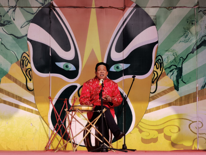 在实地调查研究途中,远处一阵又一阵鼓声和演唱声传来,这让实地调研组兴奋不已。根据声音传播的方向,实践队员们不久便找到了声源,原来是一位艺人师傅在敲击运河大鼓。运河大鼓是台儿庄的本土曲艺,2007年运河大鼓入选为山东省第一批省级非物质文化遗产名录。目前,运河大鼓已历经四百多年的发展历史。只见一位艺人师傅在台上左手持钢板,右手敲鼓,独自演唱着曲目。虽然游客数量不多,但这并未影响艺人师傅的“激情演奏”,演唱声音字正腔圆,激越高昂。观众们纷纷叫绝,台下传来一阵阵掌声,艺人师傅也露出了满足的笑容。