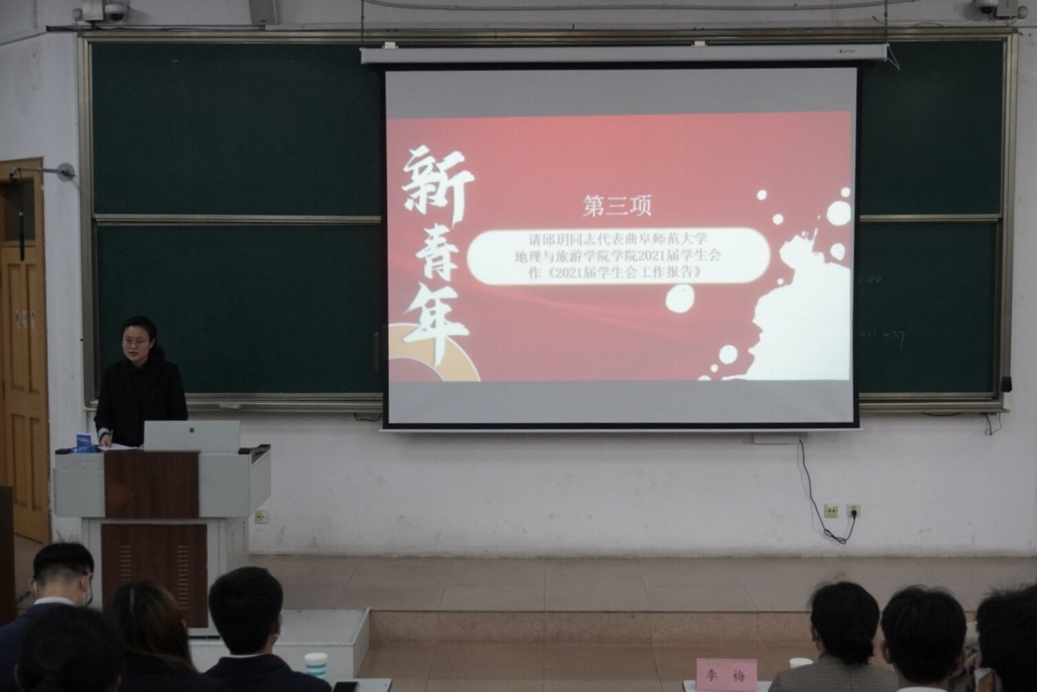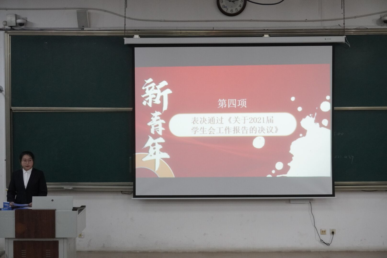 于E101召开2022届学生代表大会,本次会议由2022届团委学生会主席付玉卓主持,党委副书记刘伟、团委书记李梅、2018级辅导员田青、2020级辅导员张乃宁、2021级辅导员董青出席会议,会议应到代表280人,实到226人,符合法定人数。