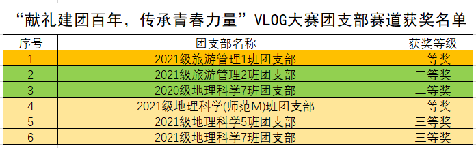 比赛分设团支部赛道和个人赛道。活动期间,同学们积极挑选不同的选题,以倾心录制、精彩剪辑、丰富内容为大家献上了一场视觉盛宴。他们有的追忆往昔,回忆团的光辉历史;有的合唱红歌,赓续爱国情怀;有的记录了团员的一天,凝聚团支部力量。作品提交后,根据团委组织部与团委老师的初审以及线上投票评出各赛道奖项。其中,2021级旅游管理1班获得团支部赛道一等奖,2020级地理科学7班、2021级旅游管理二班获得团支部赛道二等奖。