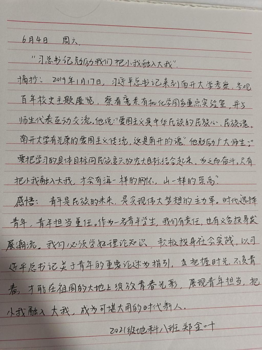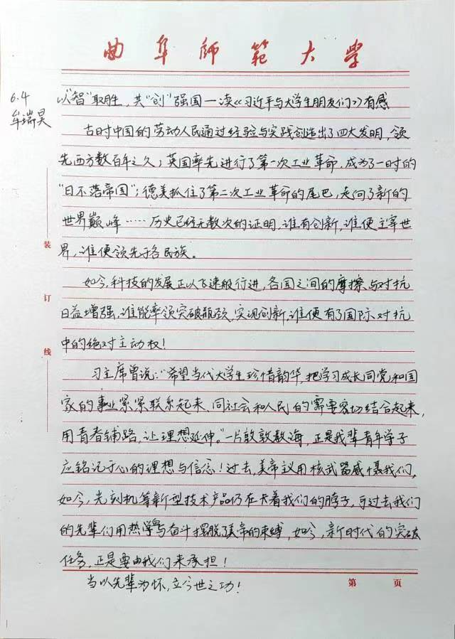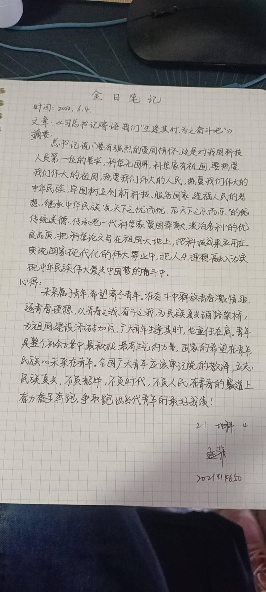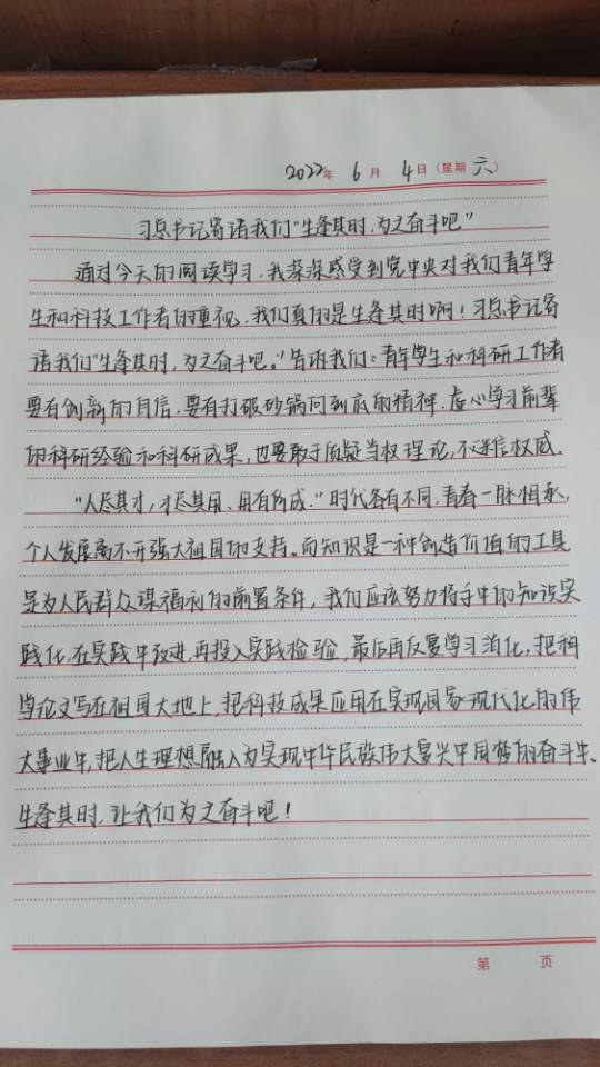 我们身为新一代青年人,要肩负时代责任、高扬理想风帆,做有担当、有追求、有品质、有作为的大学生。长江后浪推前浪,青出于蓝而胜于蓝,未来是属于我们青年人的。正所谓“人生的扣子从一开始就要扣好”,我们更要珍惜韶华,用青春铺路,让理想延伸。