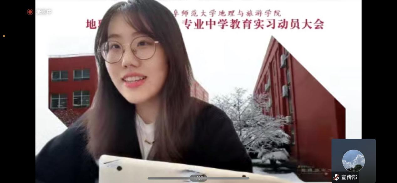 2020级地理科学公师班叶繁同学代表全体实习生发言,她代表2020级全体实习生作出承诺,虚心接受指导老师的意见并且切实落实到之后的教学工作中去,遵守规章制度,注意言行举止,充分展现曲园地理学子风采,圆满完成教学实习任务。