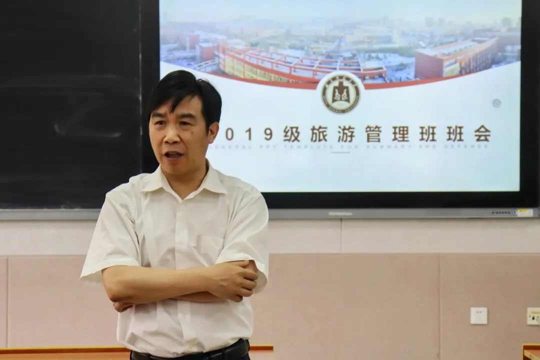 旅游管理专业优势在于规划,景区设计和旅游资源运营,希望同学们加强专业自信,找准自身定位,把握优势方向发展。在就业方面,他指出旅游管理班就业优于往年,主要在于班风学风好,班级文化优。要注重加强班级凝聚力,保持对学院、班级的归属感。随后,他强调要坚持“先就业,再择业”的原则,鼓励同学们提高自信,敢于尝试,主动搜寻相关就业信息,找到合适的就业岗位。最后,他指出大学生作为新时代青年要接续奋斗,脚踏实地,主动分析国际形势,加强民族自信,开拓自身眼界,强化专业知识,并祝福同学们在未来的成长和发展中取得满意成果。