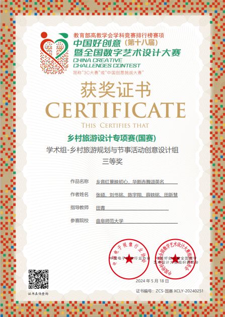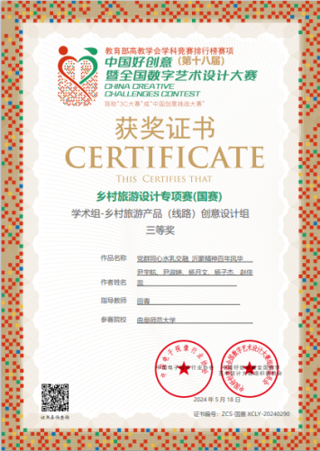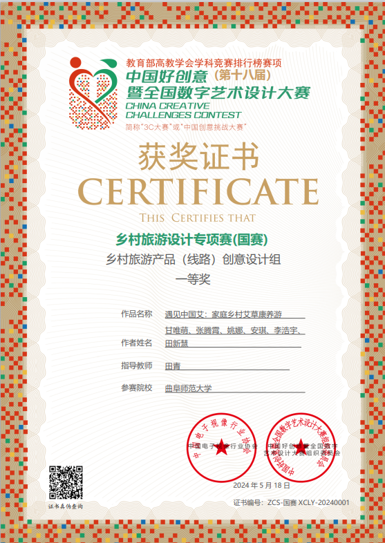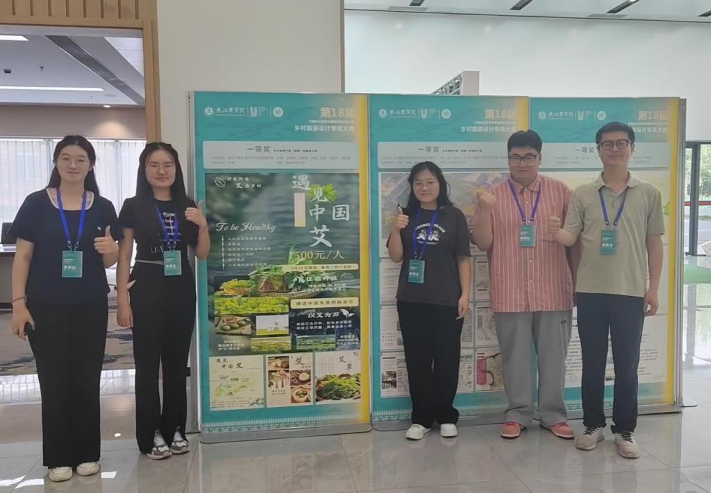 我校是大赛乡村旅游产品(路线)创意设计组获奖最多的院校。其中,甘唯萌、张腾霄、姚娜、安琪、李浩宇等同学的作品《遇见中国艾:家庭乡村艾草康养游》在田青老师指导下,以乡村旅游产品(路线)创意设计组第一名的优异成绩获一等奖,现场向各地高校的参赛选手展示。