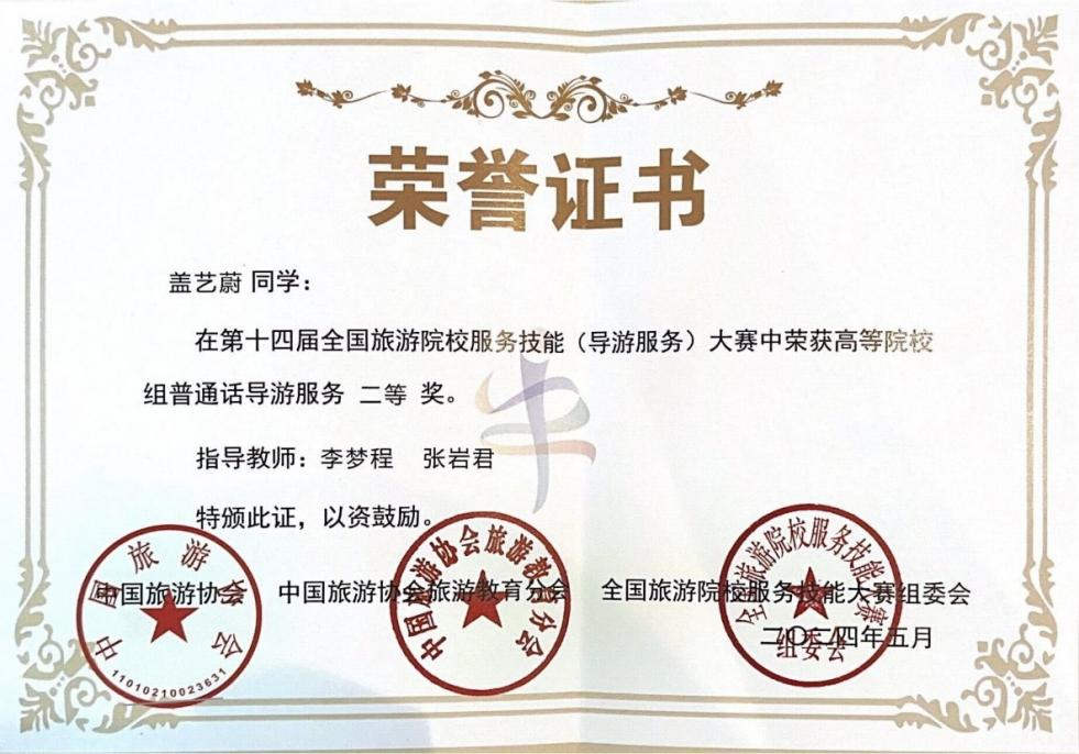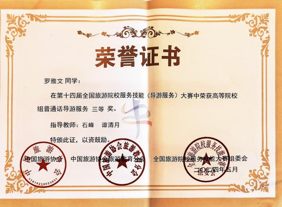 大赛为期4天,盖艺蔚同学以《孔庙—孔子的世界 世界的孔子》为主题进行导游现场讲解和专题答辩,以《古典舞—人间烟火》为主题进行才艺展示;罗雅文同学以《畅游漓江》为主题进行导游现场讲解和专题答辩,以《国家非遗京族独弦琴—高山流水》为主题进行才艺展示。