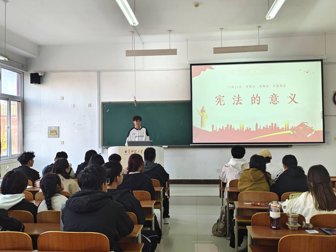 主题班会上,各班班团从宪法的概念、宪法的性质以及宪法实施的意义等方面对宪法知识进行详细地介绍和讲解,以加强同学们对宪法的认识。会中强调了宪法具有最高的法律效力,是普通法律立法的最高原则,普通法律不得和宪法相抵触,否则将被视为无效,让学生切实感受到了宪法的重要性。会中各班班团组织“宪法知识问答”活动,通过提问和抢答的方式,检验学生对宪法知识的掌握情况,进而提高同学们的宪法知识水平。