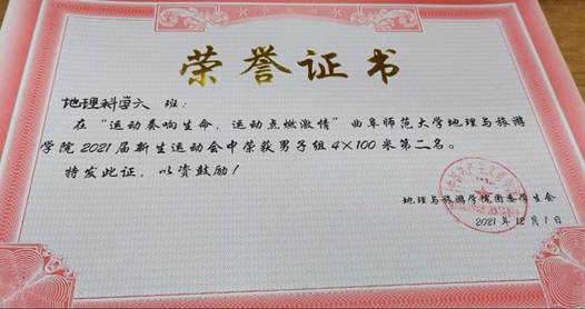 7.2021届新生运动会男子组4*100米第二名。