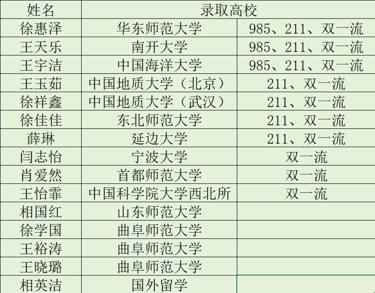 9.全班29人,超过50%的同学成功考研上岸至南开大学、中国海洋大学、中国地质大学、延边大学等学校,徐惠泽推免至华东师范大学、徐佳佳推免至东北师范大学。