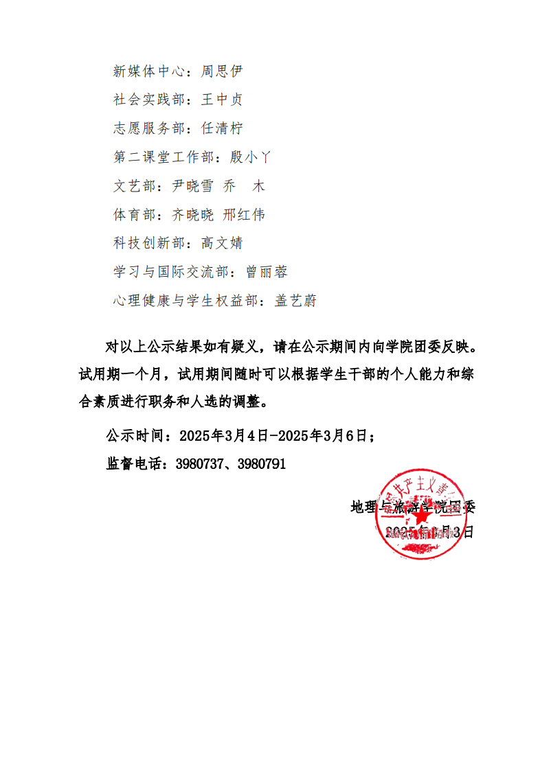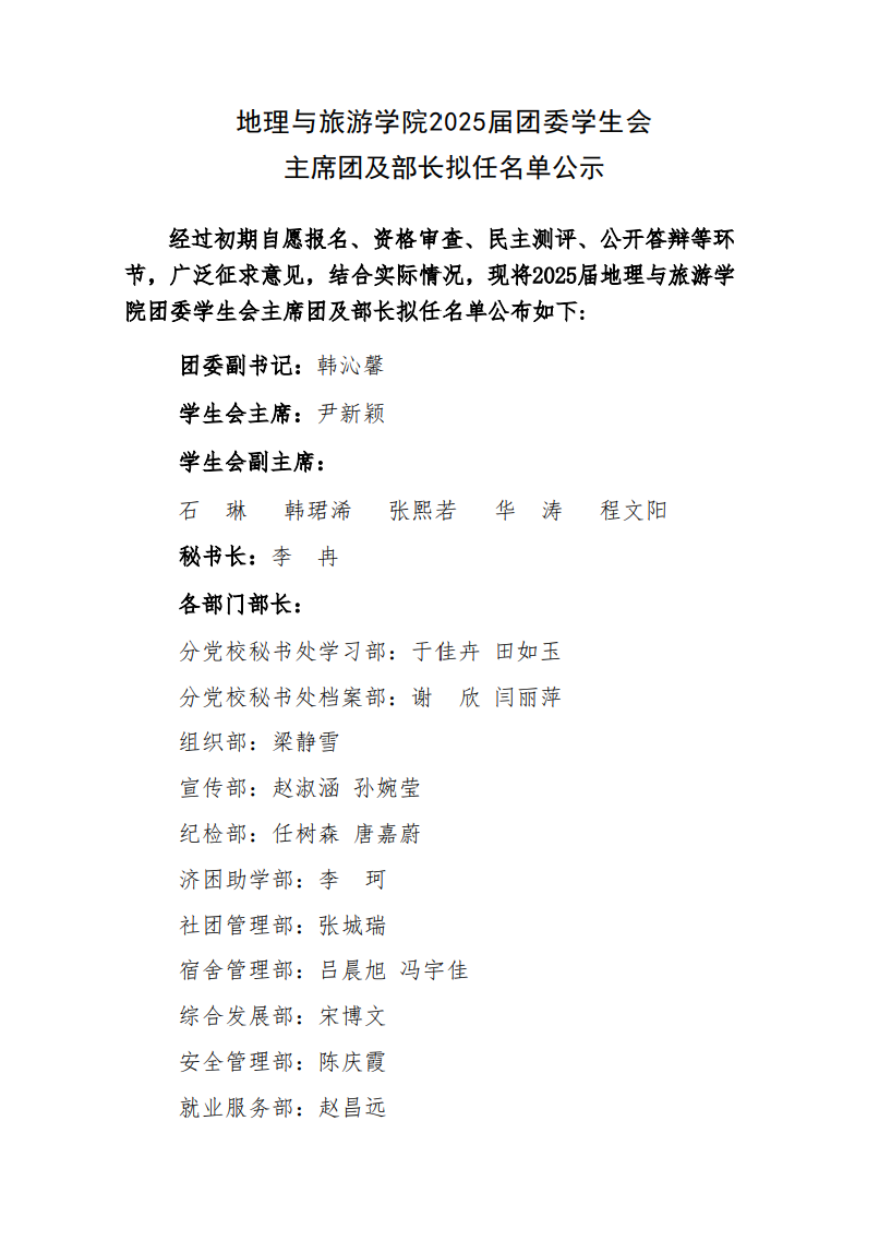 麻豆视频 2025届团委学生会主席团及部长拟任名单公示
