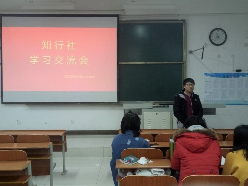 的领导下创办的一个理论实践性社团。本社团成立于2015年9月,下设有秘书处,外联部,新媒体宣传部和实践部四个部门。其中秘书处主要负责建立社团档案,组织活动材料;外联部主要负责活动的宣传及赞助,宣传部主要负责协会新媒体公众号的更新及海报展板的制作;实践部主要负责社团活动物品及场地的准备。知行社采取自学与讲座、理论与实践相结合的方式,组织会员对具体实践知识进行学习,并在此基础上积极参与社团的各项活动,积极实践,不断提高自己的理论水平和实践能力。主要开展活动有纪录片放映、地图大师、地理知识竞赛和考研经验交流会等活动。