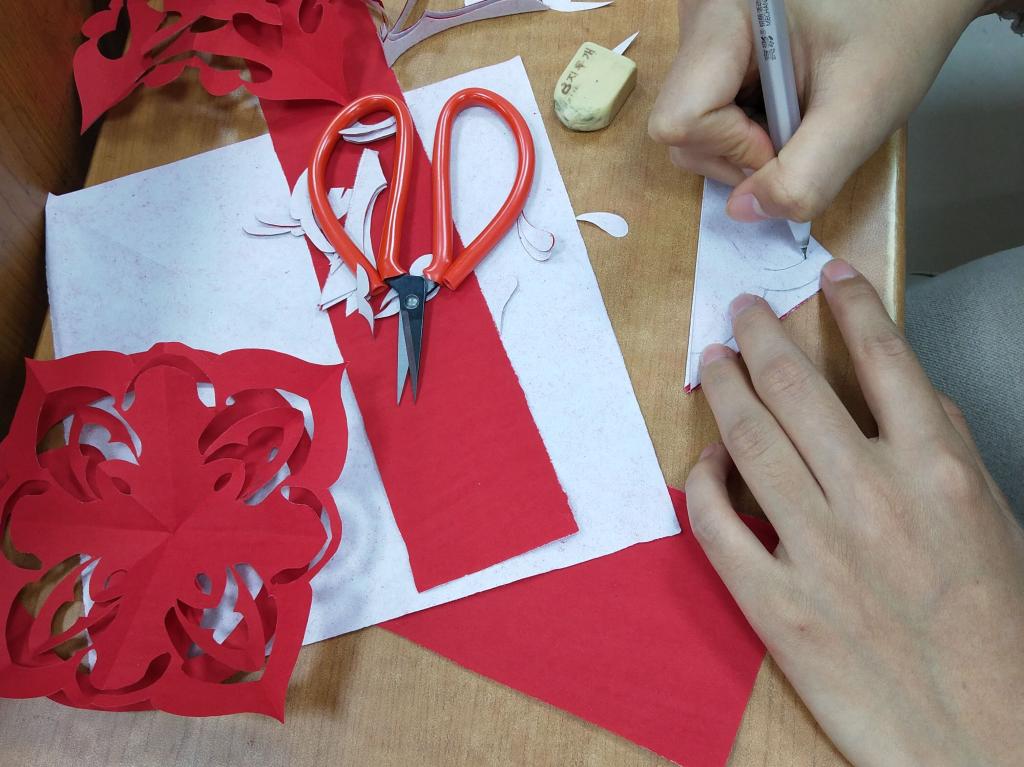 活动开始,赵薇通过PPT向大家介绍本次授课内容,并分配剪纸任务。随后她讲解剪纸步骤,教授剪刀与刻刀的用法与技巧,并亲身做出示范。大家热情高涨,积极参与,现场气氛活跃融洽。在赵薇的耐心指导下,社员开始动手创作剪纸。他们专注、细腻,认真刻画红纸,通过此次课程的学习与实践,完成一幅幅惟妙惟肖的作品。