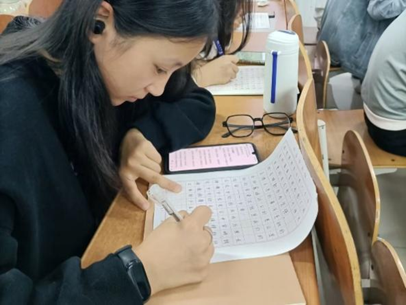 现场书法大赛分为软笔和硬笔两类,并围绕“五一劳动精神”主题进行书写相关内容。活动伊始,由社长介绍本次比赛的流程和规则,参赛者在规定纸张上完成书写。中国书法人文底蕴深厚,一字一词见文化,一点一画现法度。软笔书法选手下笔或苍劲有力,或娟秀清雅,一笔一墨一砚一人一心,各展其美;硬笔书法选手全神贯注,挥毫笔墨,书法如行云流水般自然,诗意盎然,尽情展示书写功底。比赛现场洋溢着淡淡的墨香,学子们书写认真,在纸上抒发着自己对劳动精神的赞美,沾墨、提笔、运笔,每个动作都倾注着对劳动的崇高敬意。