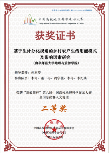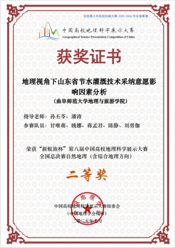 孙丕苓、潘涛老师指导,学生甘唯萌、姚娜、蒋孟君、陈静、刘勇伽完成的作品《地理视角下山东省节水灌溉技术采纳意愿影响因素分析》获得自然地理(含综合地理方向)组二等奖;孙丕苓老师指导,李珂、董一冉、冯宇佳、李冉、李纪琰完成的作品《基于生计分化视角的乡村农户生活用能模式及影响因素研究》获得人文地理组二等奖。李珂、李冉、冯宇佳三位同学作为参赛代表队伍接受央视频的采访,充分彰显了麻豆视频