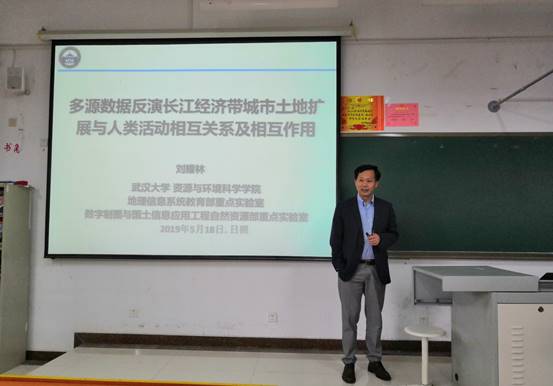 做了题为“多源数据反演长江经济带城市土地扩展与人类活动相互关系及相互作用”的学术报告。报告会由院长张全景教授主持,学院相关专业教师、研究生和本科生共一百余人参加了报告会。