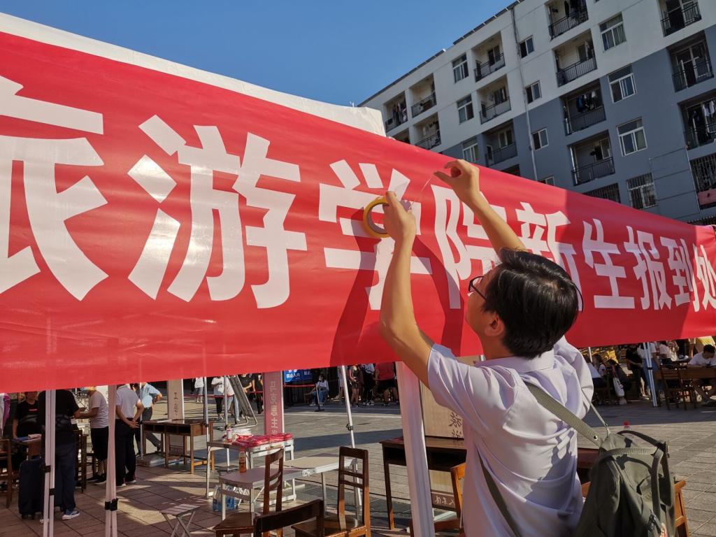 2019级辅导员李梅、2020级辅导员田青一早来到学院的注册点,监督当天的迎新布置工作,学院相关工作人员、学生志愿者们也早早就位,准备迎接新生。
