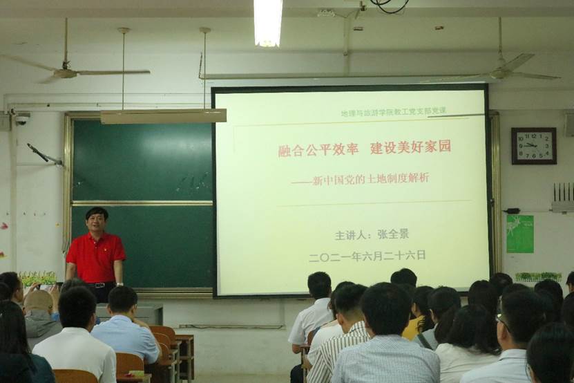 为深入学习贯彻习近平总书记在党史学习教育动员大会上的重要讲话精神,营造浓厚的党史学习氛围,6月26日上午,院长张全景以“融合公平效率 建设美好家园——新中国党的土地制度解析”为题,为学院全体党员讲授了一堂别开生面的主题党课。学院党委书记苏占兵、党委副书记刘伟、副院长吴军、院长助理于伟出席,学院全体党员认真聆听了党课并展开深入讨论。