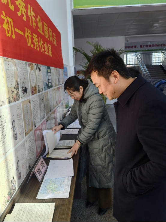 党委副书记刘伟与实习指导老师周维国、潘涛一同参观了初中生的优秀假期作业,两校交接工作圆满完成。