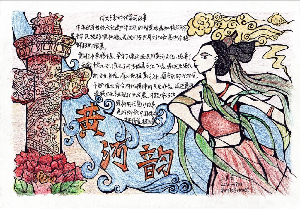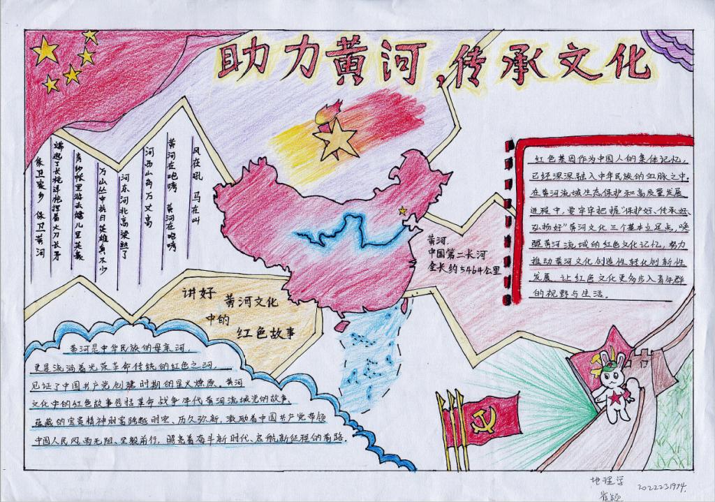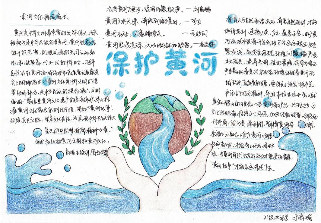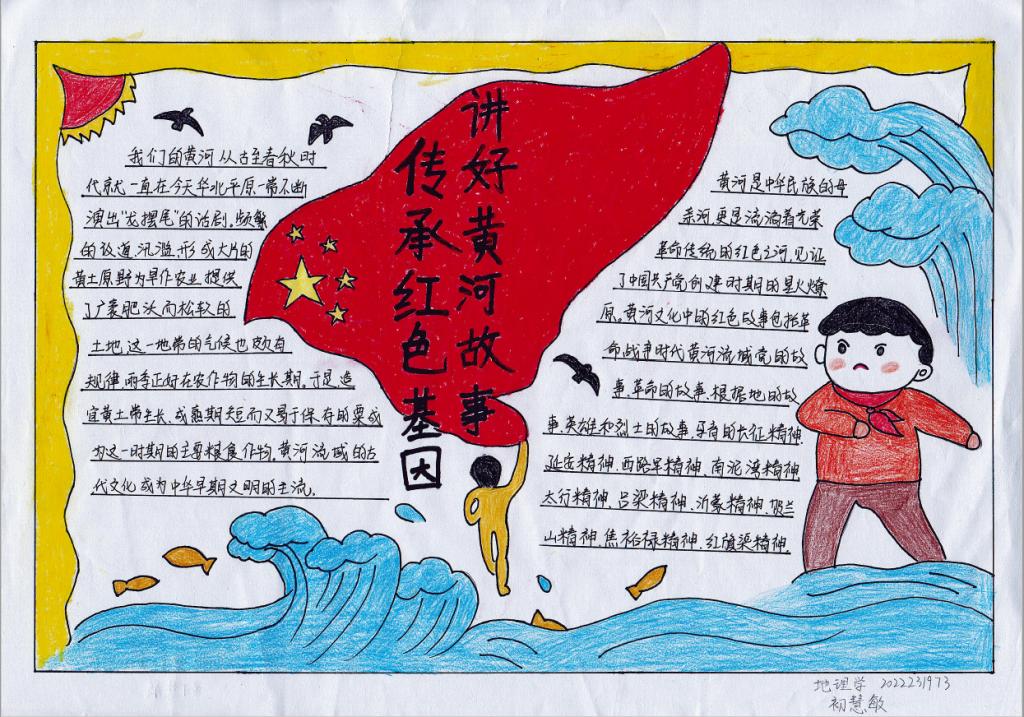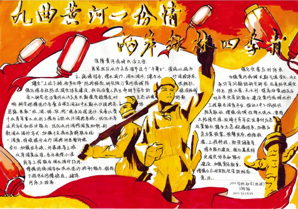 团委主办,研究生团支部承办开展了以“诗韵黄河”为主题的手抄报制作活动。此次活动旨在动员共青团员投身强国建设,号召共青团员保护母亲河,争做生态文明的传播者、争当生态保护的捍卫者、勇当生态建设的实践者,在加强黄河流域生态环境保护、传承弘扬黄河文化等方面勇挑重担、建功立业,为助推黄河流域生态保护和高质量发展战略贡献青春力量。