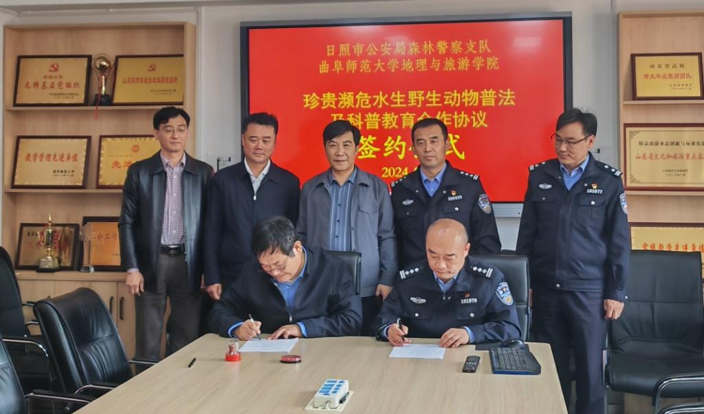 与日照市公安局森林警察支队签订“珍贵濒危水生野生动物普法与科普教育合作协议”。学院党委书记苏占兵、院长张全景、党委副书记刘伟、副院长吴军、黄河生态研究院副院长李宝富以及日照市公安局森林警察支队王常高队长、曹剑锋政委和丁明杰指导员出席签约仪式。