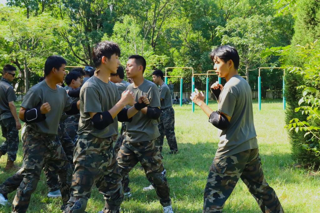 教官为同学们讲解内务整理技巧,同学们积极练习